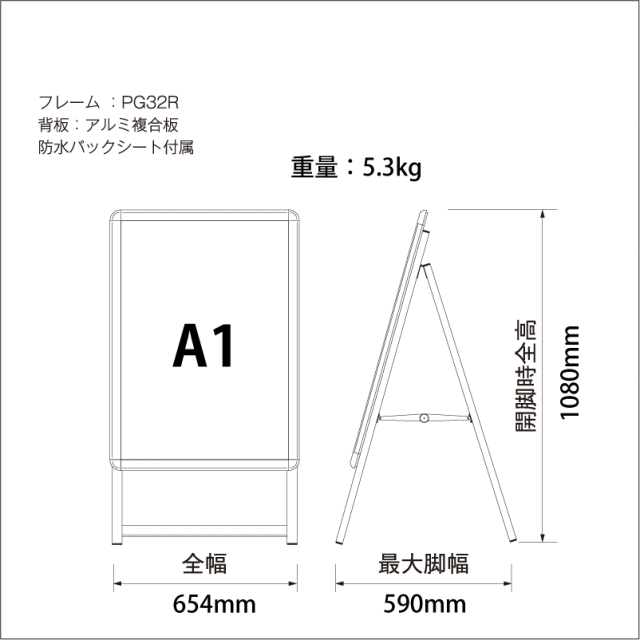 TOPA型屋外防水フレーム 屋外用(防水)仕様のP-G32を使用したA型ポスターフレームです。 防水パックが標準装備されすぐにお使い頂けます。 屋外(防水パック仕様)Aサイン片面 A1(594mm x 841mm) 価格: ¥31,740 (税込) [ポイント還元 952ポイント~] 販売期間: 数量: 個 フレームカラー在庫購入シルバー在庫あり ブラック在庫あり フレームカラー在庫購入シルバー在庫あり ブラック在庫あり 返品についての詳細はこちら